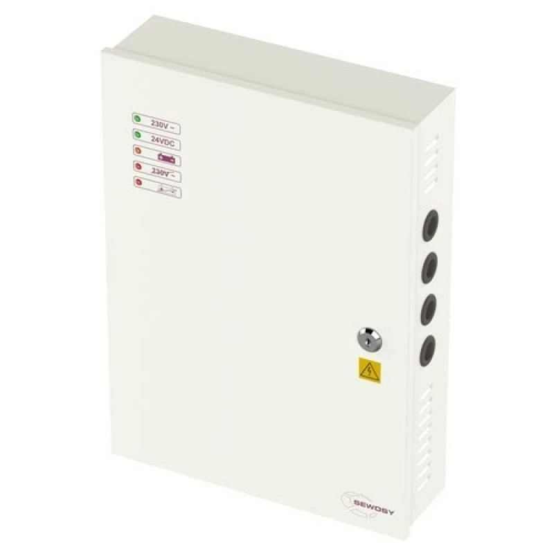 AD2405R SEWOSY Alimentation à découpage en coffret avec reis défaut. Le courant de sortie est de 5A maximum à raccorder à des appareils de verrouilge et de contrôle d’accès en simultané grâce à ses 2 sorties. Le branchement se fait par bornier à vis. Possibilité de rajouter deux batteries, de 7 Ah chacune, dans le coffret, pour assurer un système de verrouilge en cas de coupure de courant (non fournies). Le reis intégré permet de signaler un problème sur le secteur. Un dispositif d’autoprotection via un contact inverseur permet d’envoyer un signal en cas d’ouverture du coffret pour une meilleure sécurité. Trois voyants lumineux en LED sur face externe du coffret indiquent l’état de marche de l’alimentation, son voltage et charge de batterie.