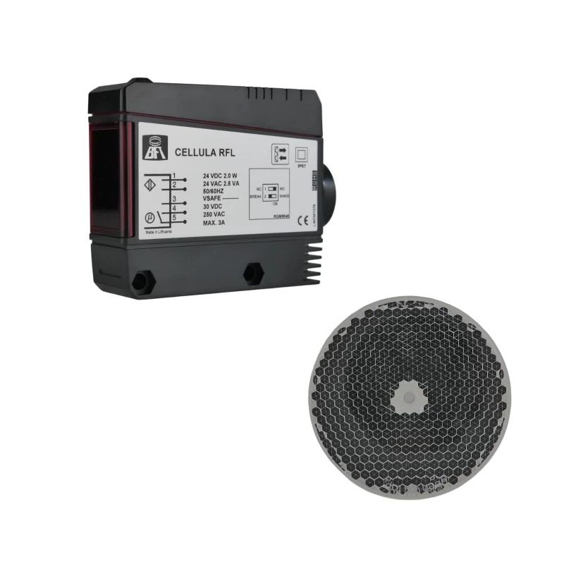 Pack BFT Cellu RFL et catadioptre RFLP. Ce pack comprend une photocellule Ă rĂ©flexion pte CELLULA RFL, Ă installer Ă l’extĂ©rieur, portĂ©e : 12 m, alimentation : 24 VCA-CC. Ainsi qu’un catadioptre RFLP pour photocellule Ă rĂ©flexion CELLULA RFL.